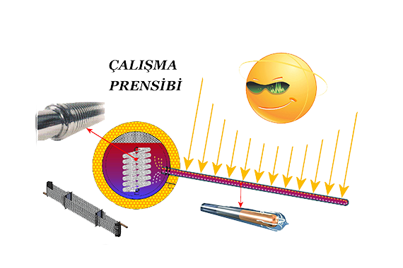 Vakum tüp, iç içe geçmiş iki cam tüpün üst kısımlarından birbirlerine kaynatılması ve büyük tüpün alt kısmının kapatılması sonucunda oluşmuştur. İki tüp arasındaki hava, büyük tüpün alt kısmından emilerek dışarı atılır ve sızdırmazlığı sağlanır. İç içe geçmiş bu iki tüpün arasındaki vakum basıncı 5×10-3 Pa.’dır. Bu sayede ısı transferindeki ve ısının depolanmasındaki kayıplar minimuma indirgenmiştir. Bu tüpler oldukça güçlü ve saydam bir yapıya sahiptir. 2.5 cm çapında yağan doluya dayanır ve yüksek kalitede borosilikatlı camdan imal edilmiştir. İçteki tüpün dış yüzeyi özel bir seçici yüzeyle kaplanmıştır. Seçici yüzey kaplaması için (Al-N/Al) kullanılmaktadır. NASA tarafından bulunan seçici yüzey sayesinde, güneş ışınları mükemmel bir şekilde emilip ısıya çevrilir ve yansıma minimum düzeye indirgenir.
