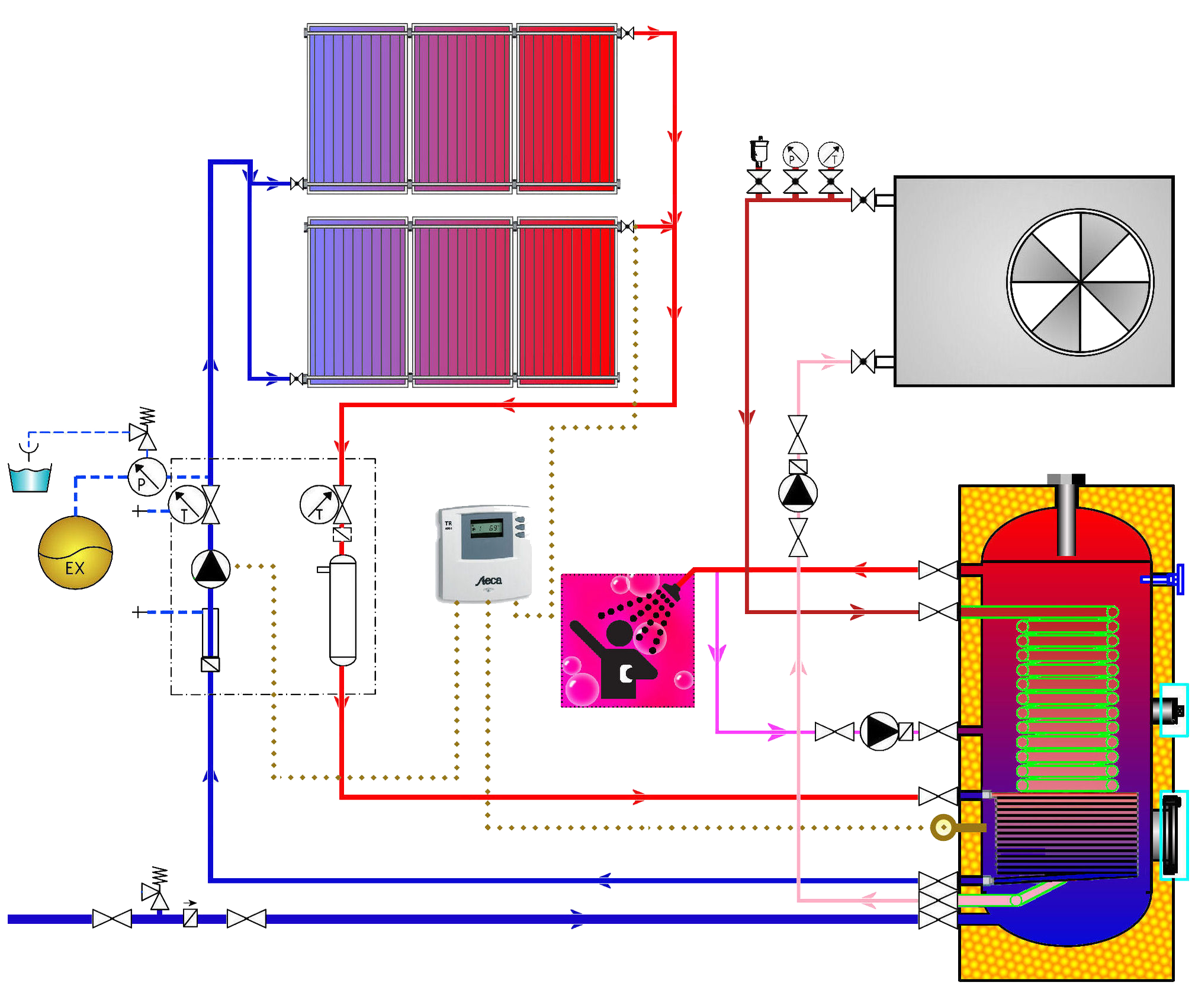 Yani sistem sirkülasyonu pompa ile sağlanır. Sistem; ısı pompası (uzun) ve güneş enerjisi serpantinli maxi boyler, kollektör, pompa grubu ve otomasyon grubu olmak üzere 4 ana elemandan oluşmaktadır. Çatı altına veya evin uygun herhangi bir bölümüne yerleştirdiğimiz çift serpantinli maxi boyler ve kollektörler haricinde pompa grubu faliyetleri kumanda paneli tarafından otomatik olarak koordine edilir.