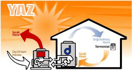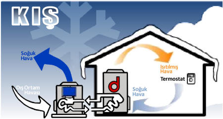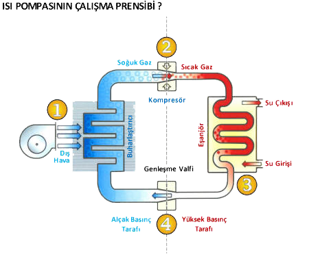3- Kapalı devre içerisinde soğutucu, sıvılaştırıcı üzerinde dolaşarak ısıtma sistemi sıvısını ısıtır.